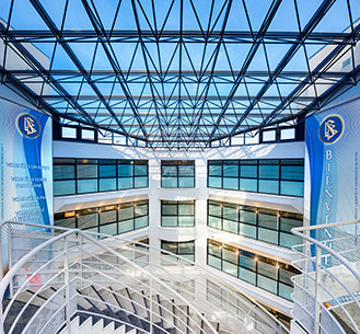 Rising six stories above Reception is the building’s stunning grand atrium. The design was inspired by the sequoia, including the circular stairwell lined with an intricate leaf pattern.